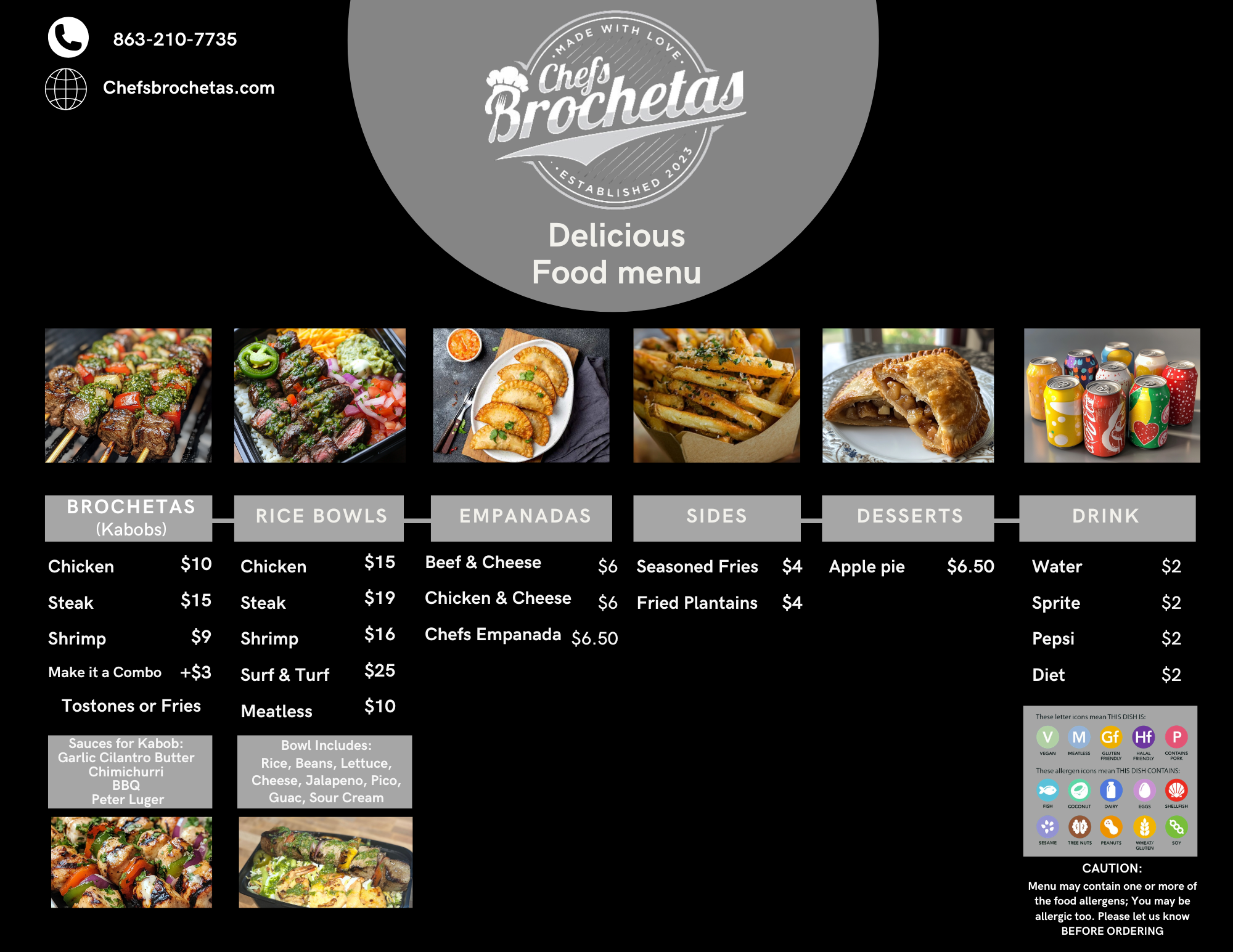 Experience the fusion of Spanish and Italian flavors with Chefs Brochetas Food Truck in Daytona beach, Port Orange and surrounding areas. Our talented chefs create mouthwatering food using only the freshest ingredients. From savory kabobs, rice bowls, and empanadas to delectable desserts, every bite is packed with delicious authentic flavors. We offer pop-up dining, pick up, takeout, food truck events, catering, and delivery with DoorDash.